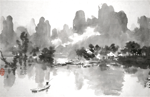《漓江春雨》,充滿(mǎn)濃郁的生活氣息,以大潑墨的手法描繪了甲天下的桂林山水,情景交融,用筆輕快,保留傳統筆法的提按頓挫的節奏感和韻律感,是中國大寫(xiě)意山水畫(huà)的代表之作。